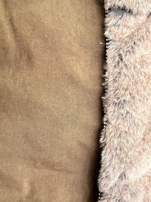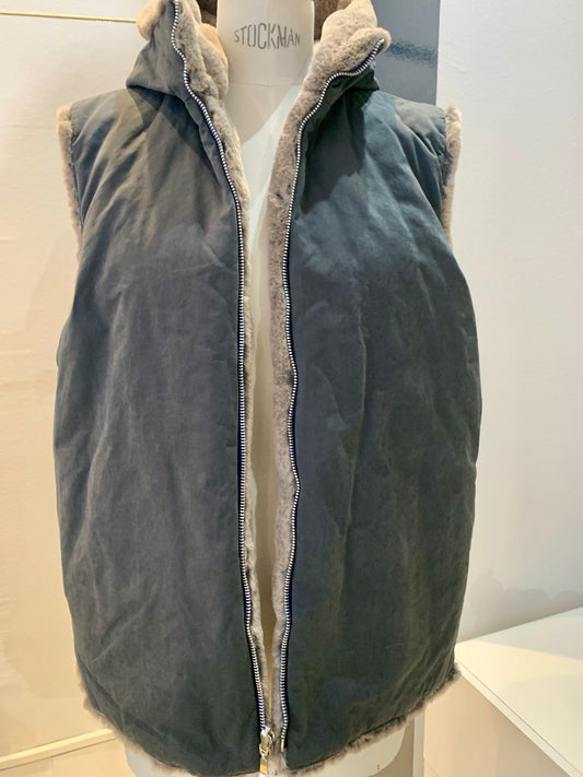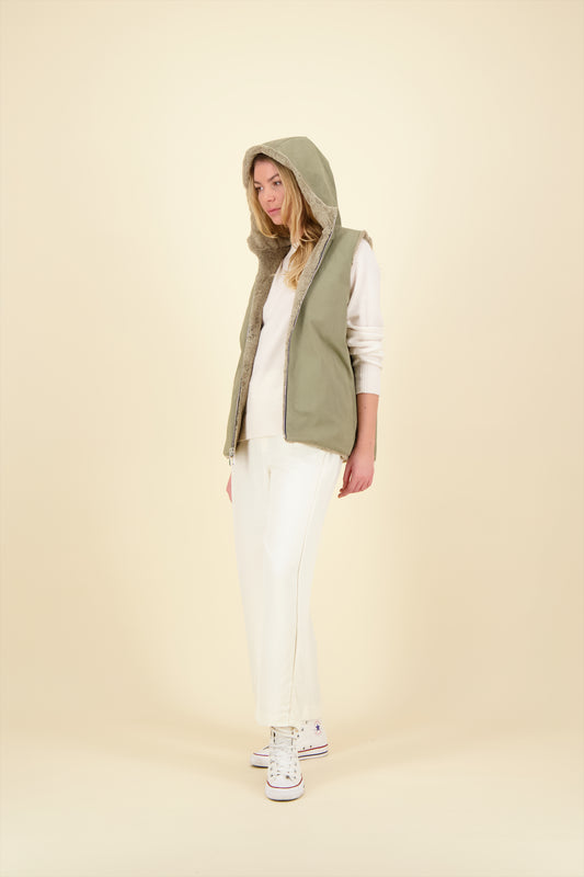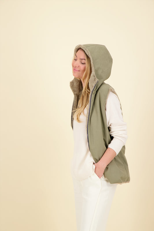 GILET REVERSIBLE disponible en coton déperlant bronze, gris, craie et fausse fourrure