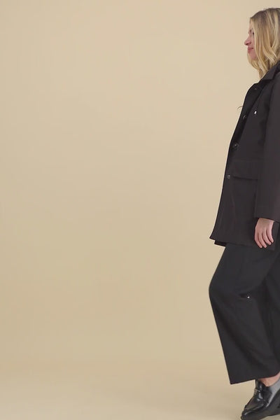 Waterproof nylon parka with removable hood, faux fur lining and side slits.
