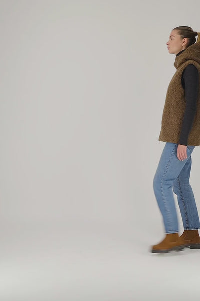 Gilet réversible à capuche en coton et fausse fourrure. Peut se porter seul avec une grosse maille ou sous un manteau.